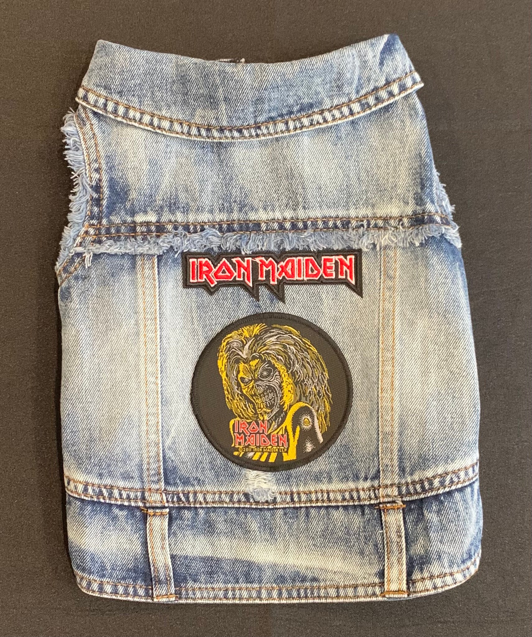 Faded denim dog vest with officially licensed band patches. Contact us for custom size ordering.
